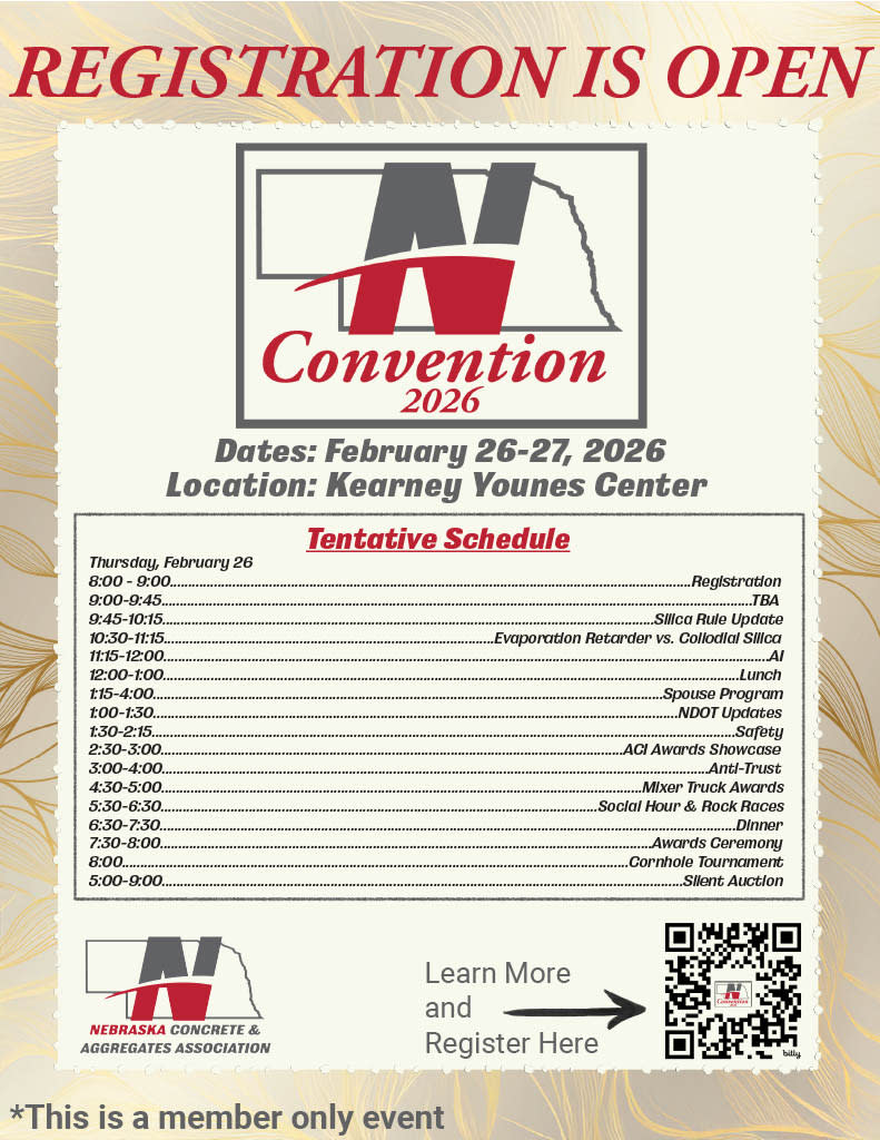 The Nebraska Concrete & Aggregates Association welcomes all members to join us for the 67th Annual Convention from February 26-27, 2026 at the Younes Conference Center in Kearney, Nebraska. We look forward to having a space to meet our new members and look over the year we have had as an association. Look for future emails & posts and follow us on social media and our website to stay updated about this event and other important industry events.